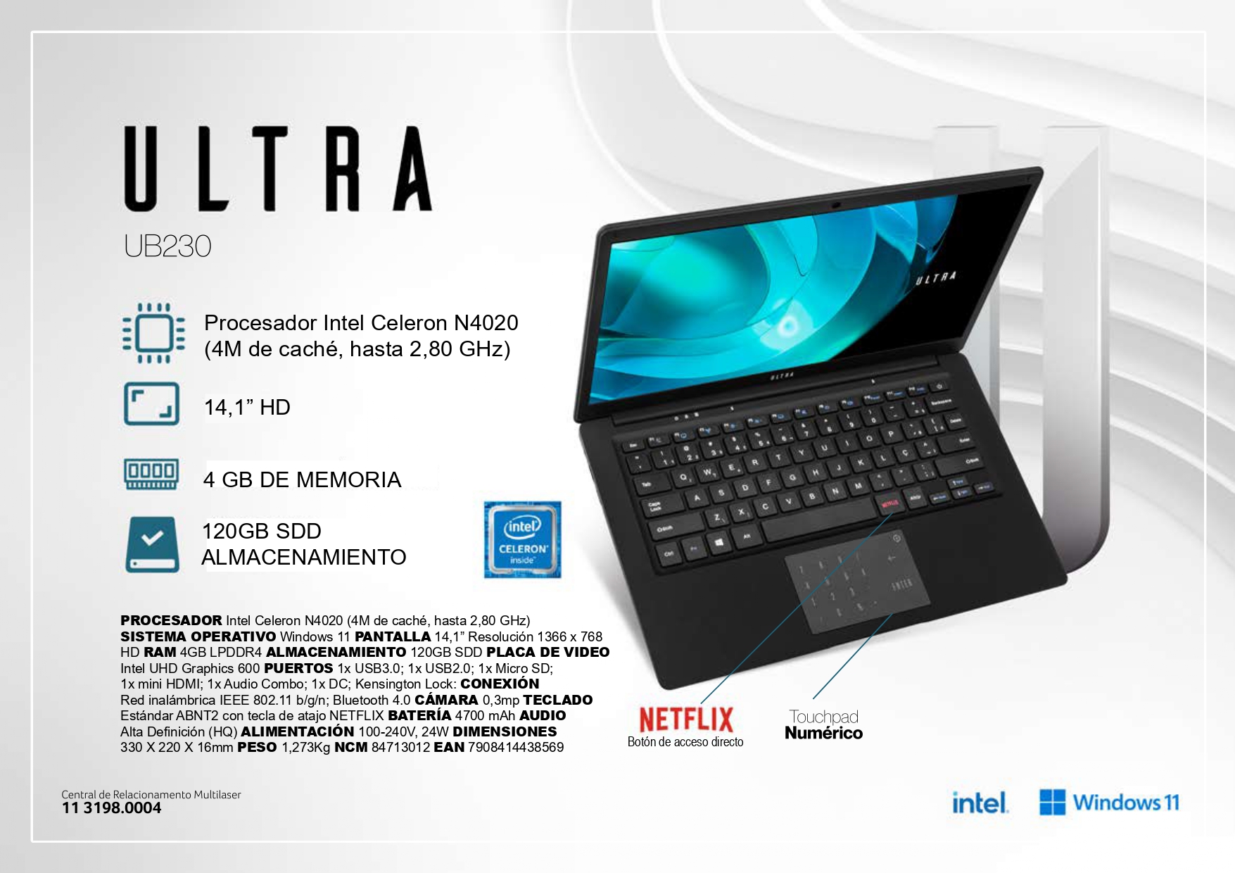 Notebook 4GB 120SSD Celeron W11 14.1" Negro Ultra UB230
