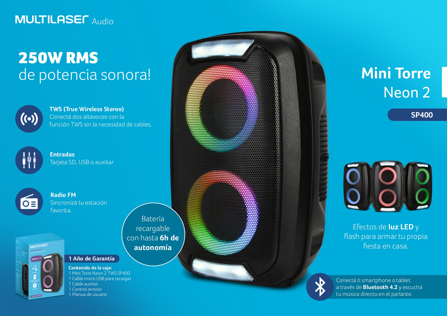 El Parlante Neon 2 cuenta con 250W RMS de potencia con Flash LED y alta fidelidad al sonido, con hasta 6 horas de duración*.